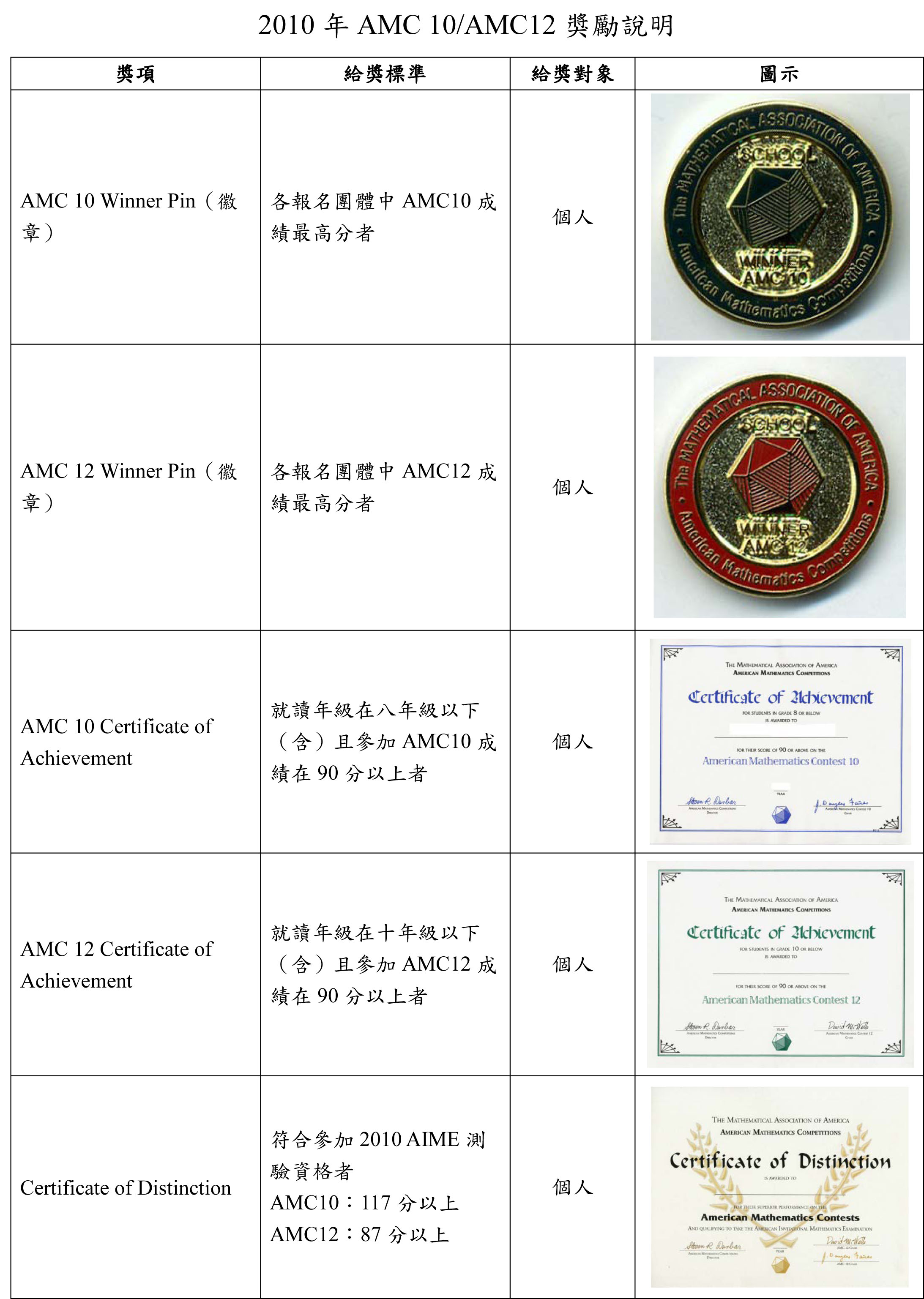 2010年全美中學數學分級能力測驗AMC10/AMC12獎勵說明